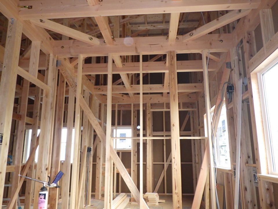 デザインも性能もこだわりたいあなたへ。 完成してからでは見ることができない無垢材を使った重厚な構造や セルロースファイバーを使った断熱の様子 筋交い+…